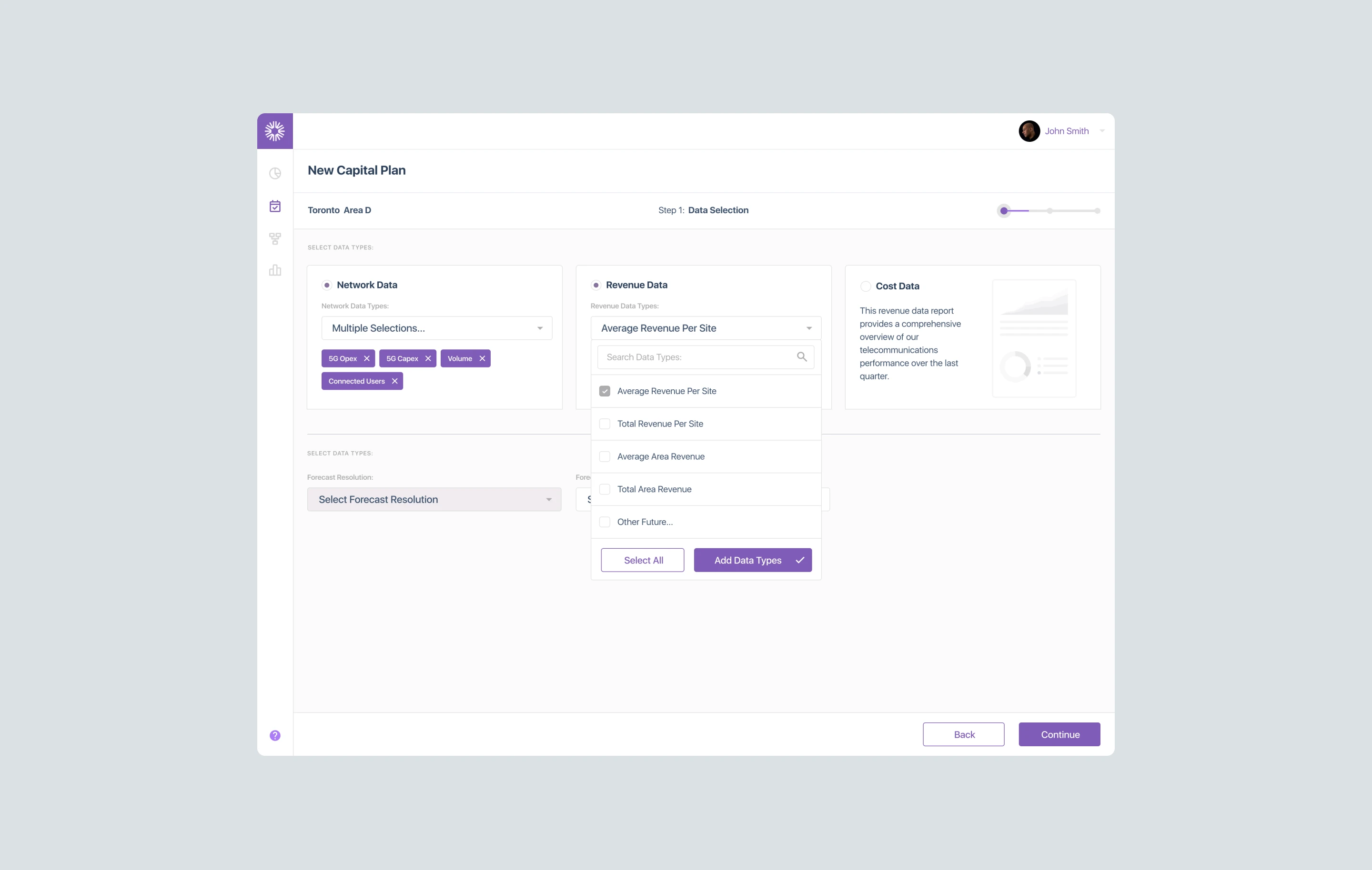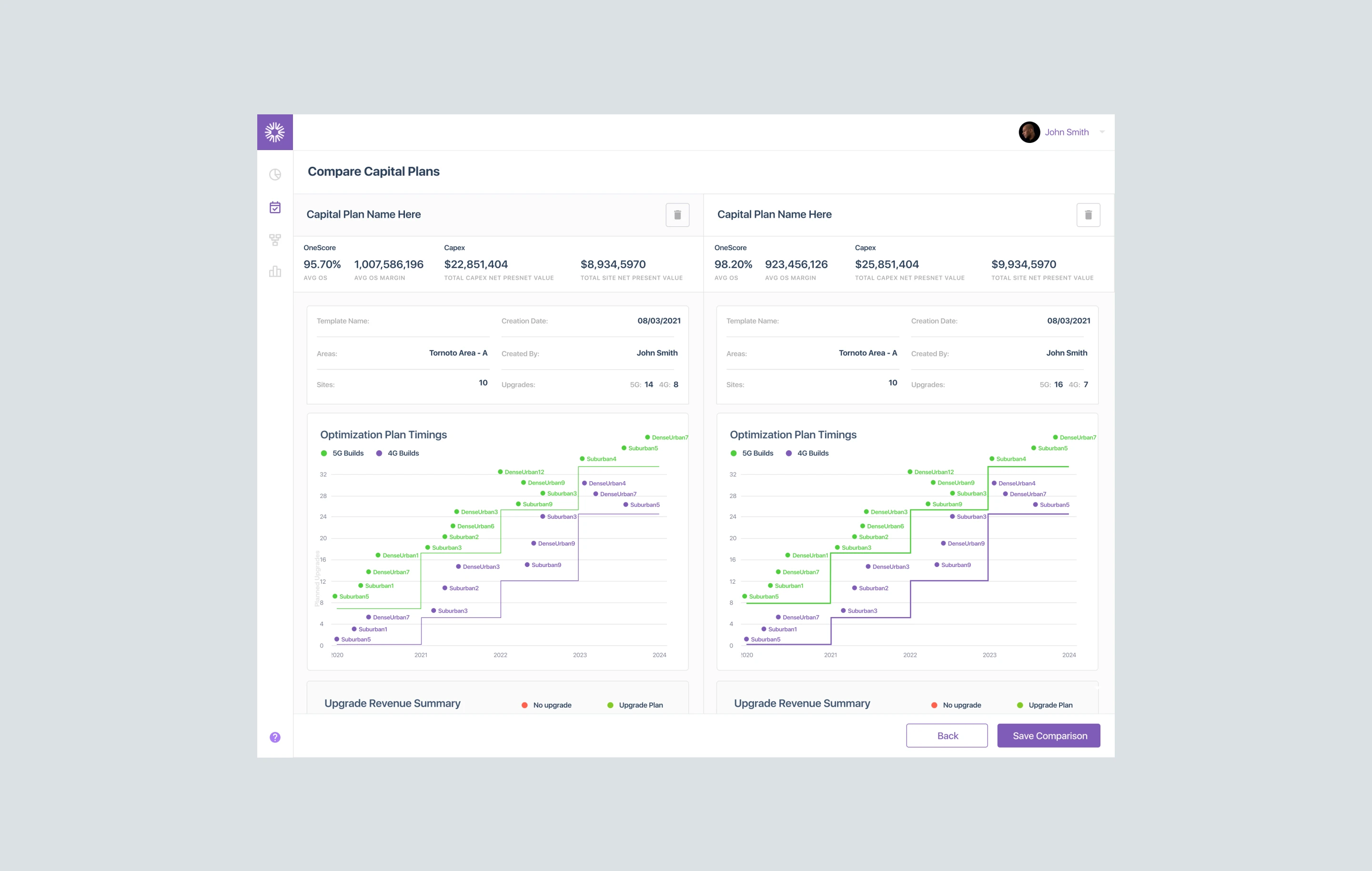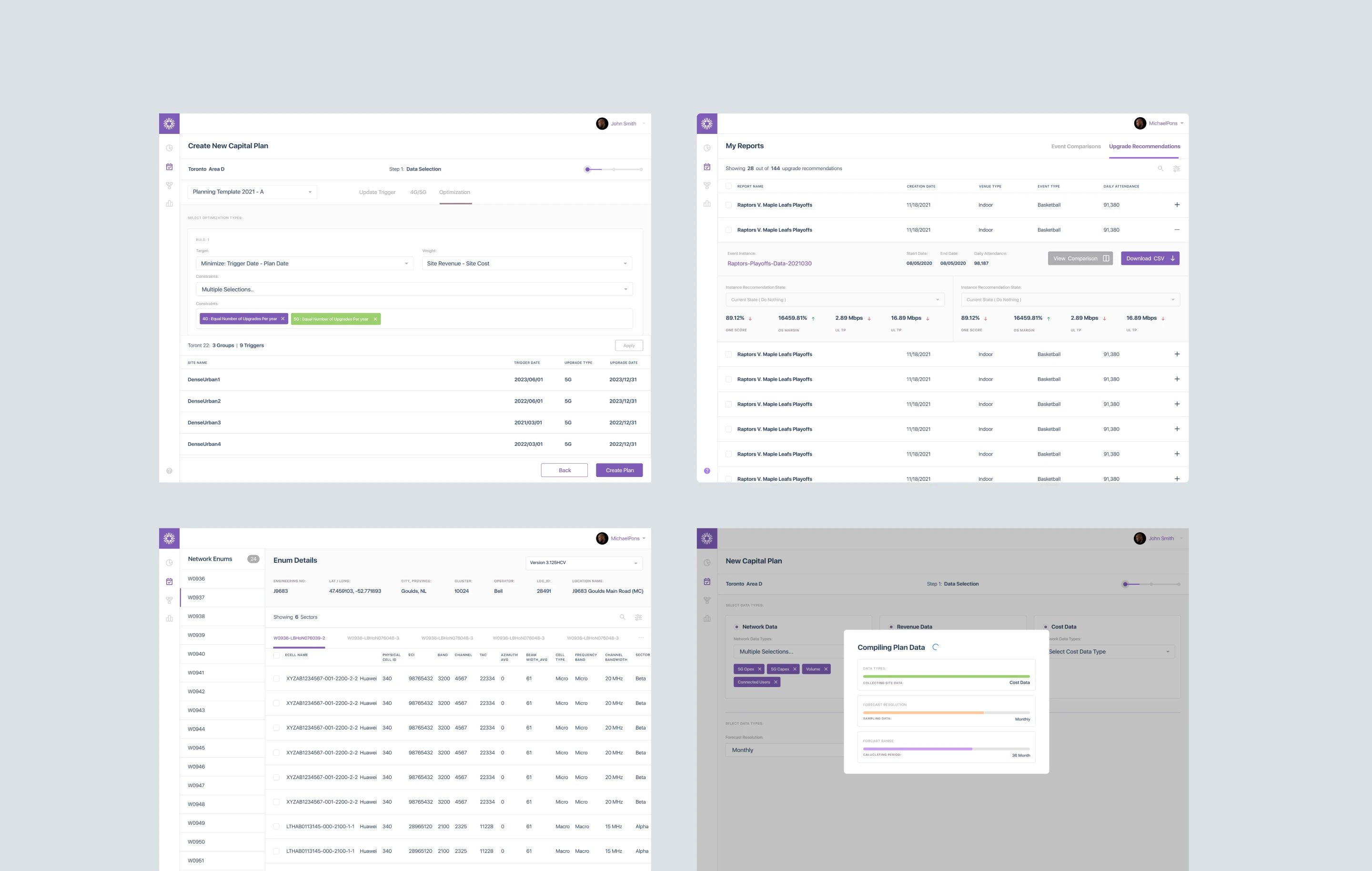 We designed a unified capital planning tool that replaced Bell's disconnected tool chain: spreadsheets, ring diagrams, and siloed data terminals, consolidated into a single application. Capacity planners could model 4 data scenarios, compare sites side-by-side, configure triggers and thresholds, and generate forecasts without context-switching between tools.