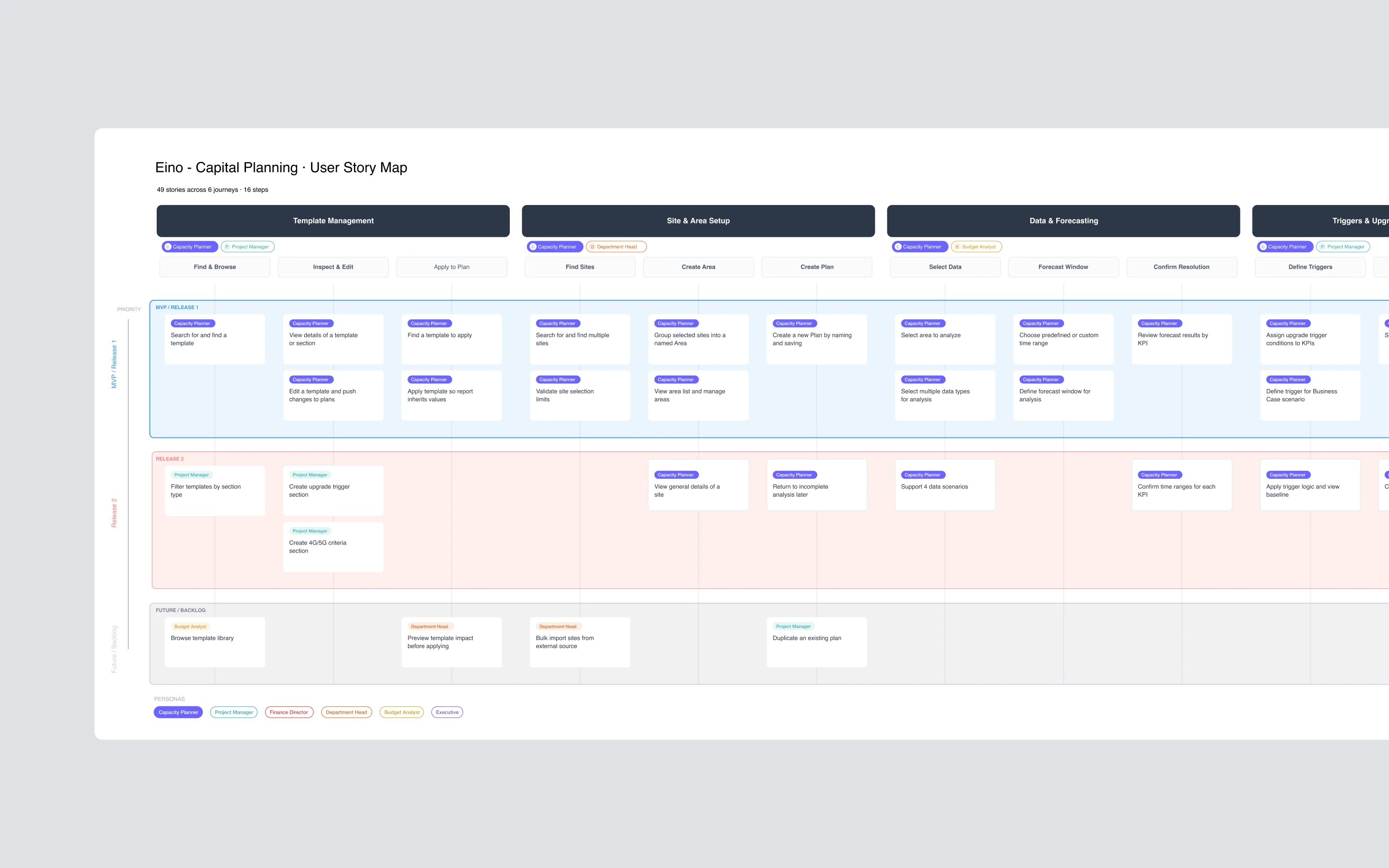 49 stories mapped and prioritized across 6 user journeys