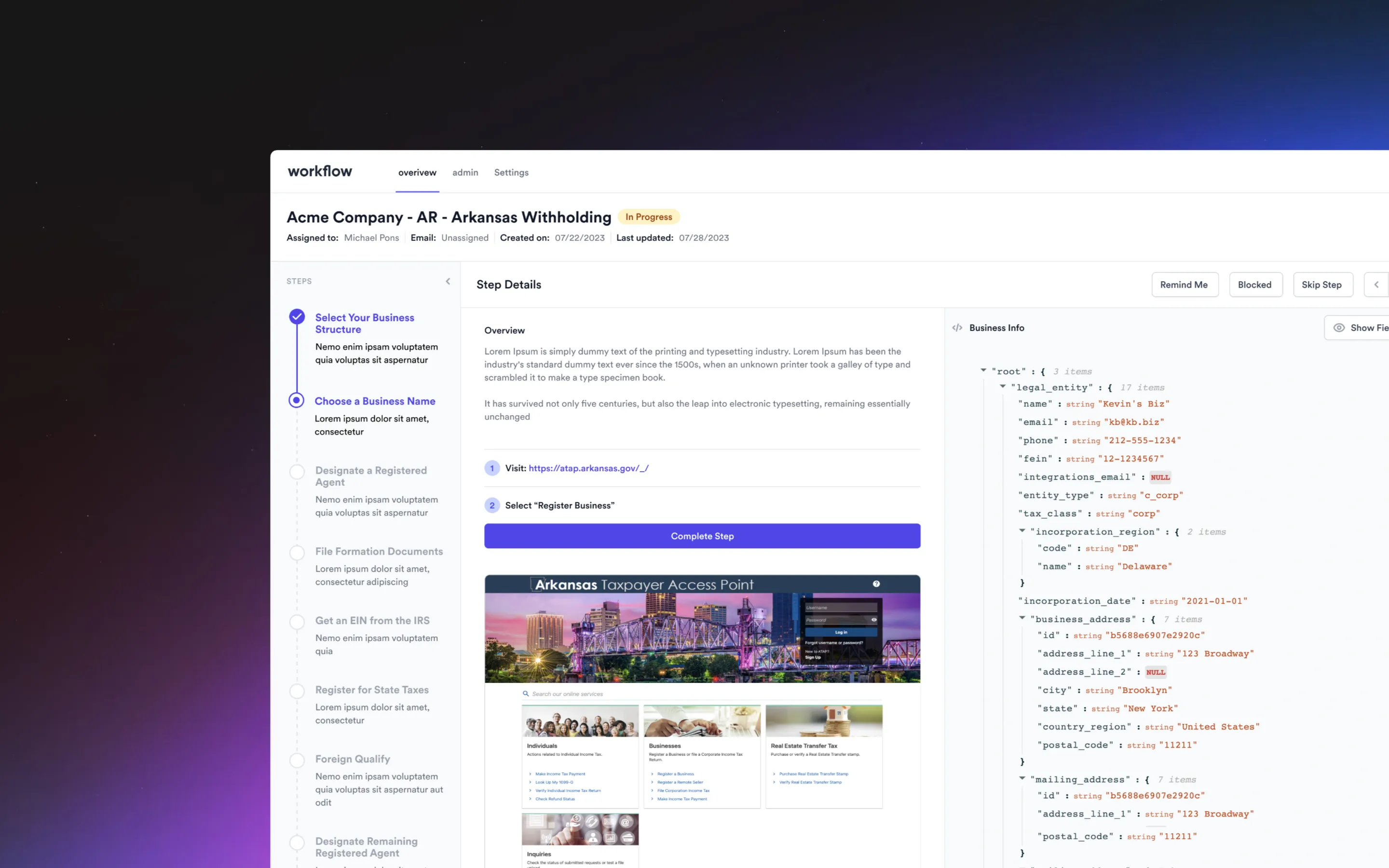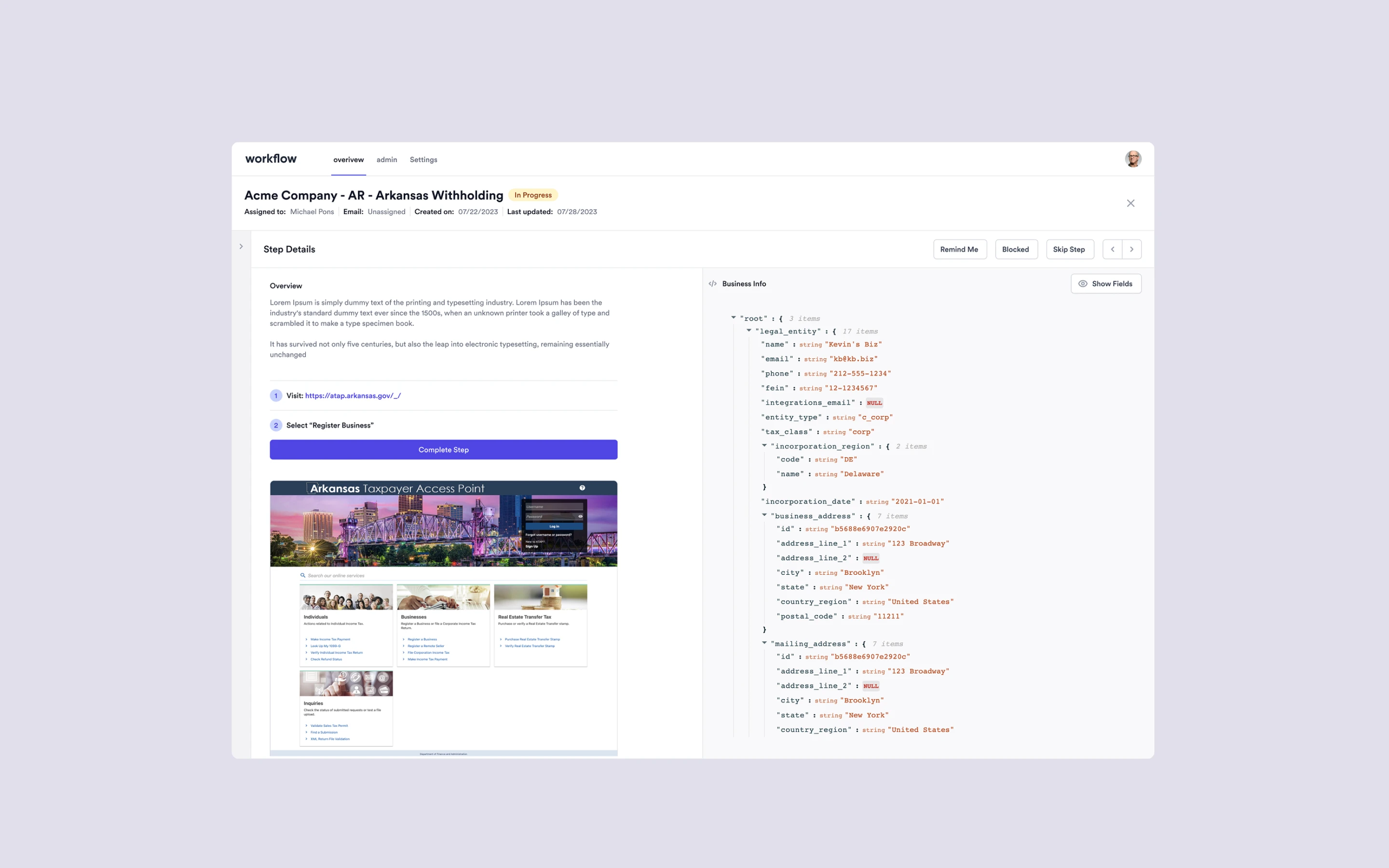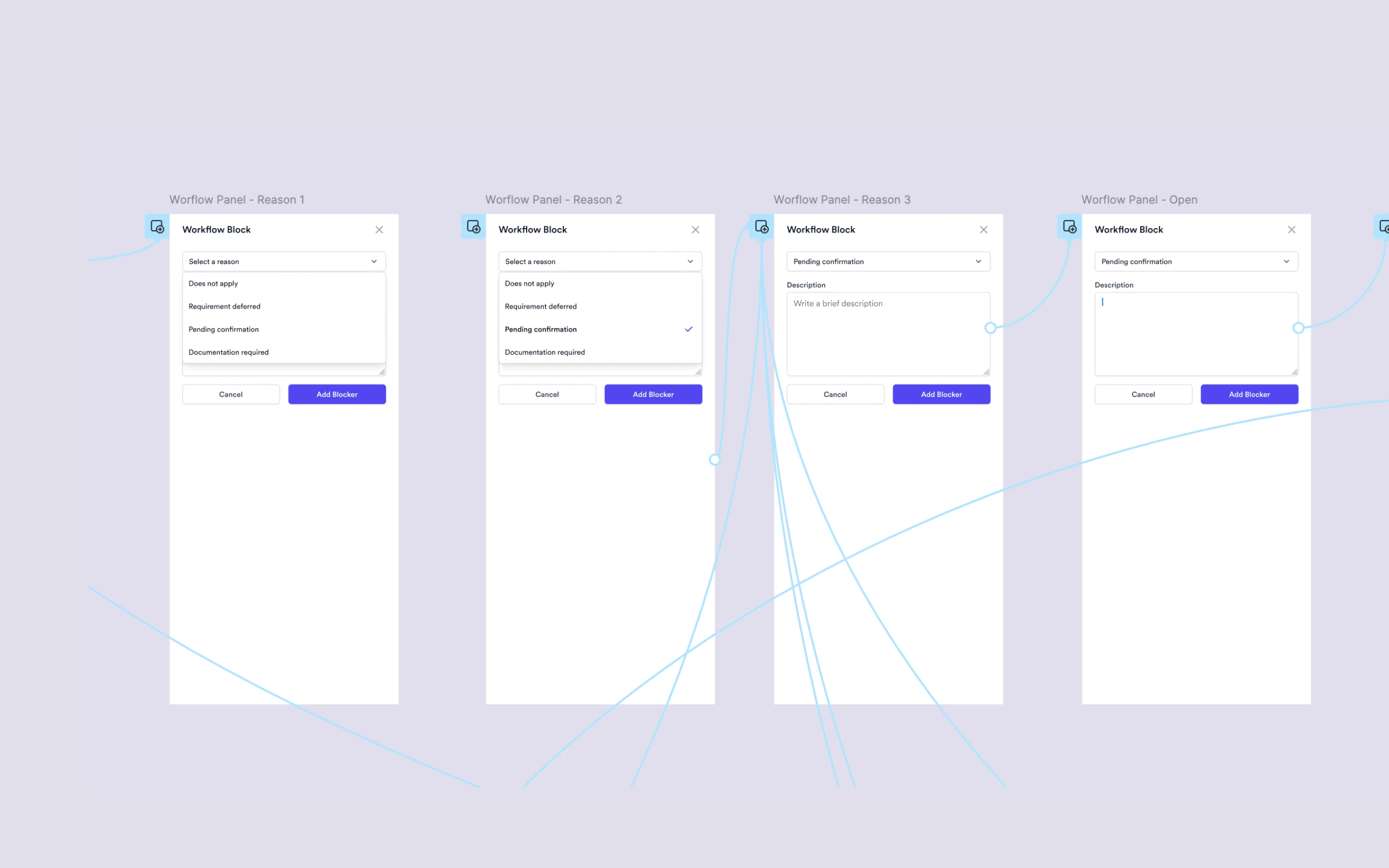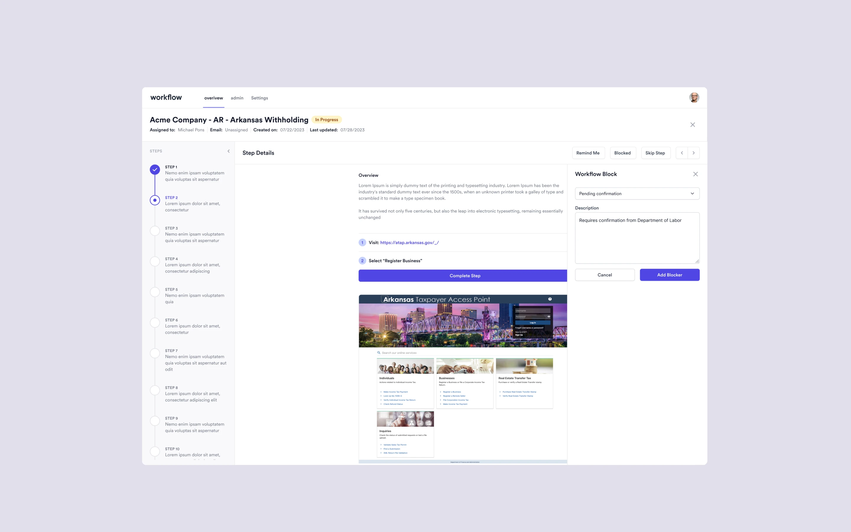 Step Blocking: Users can block specific steps in the workflow with justifications and reminders.