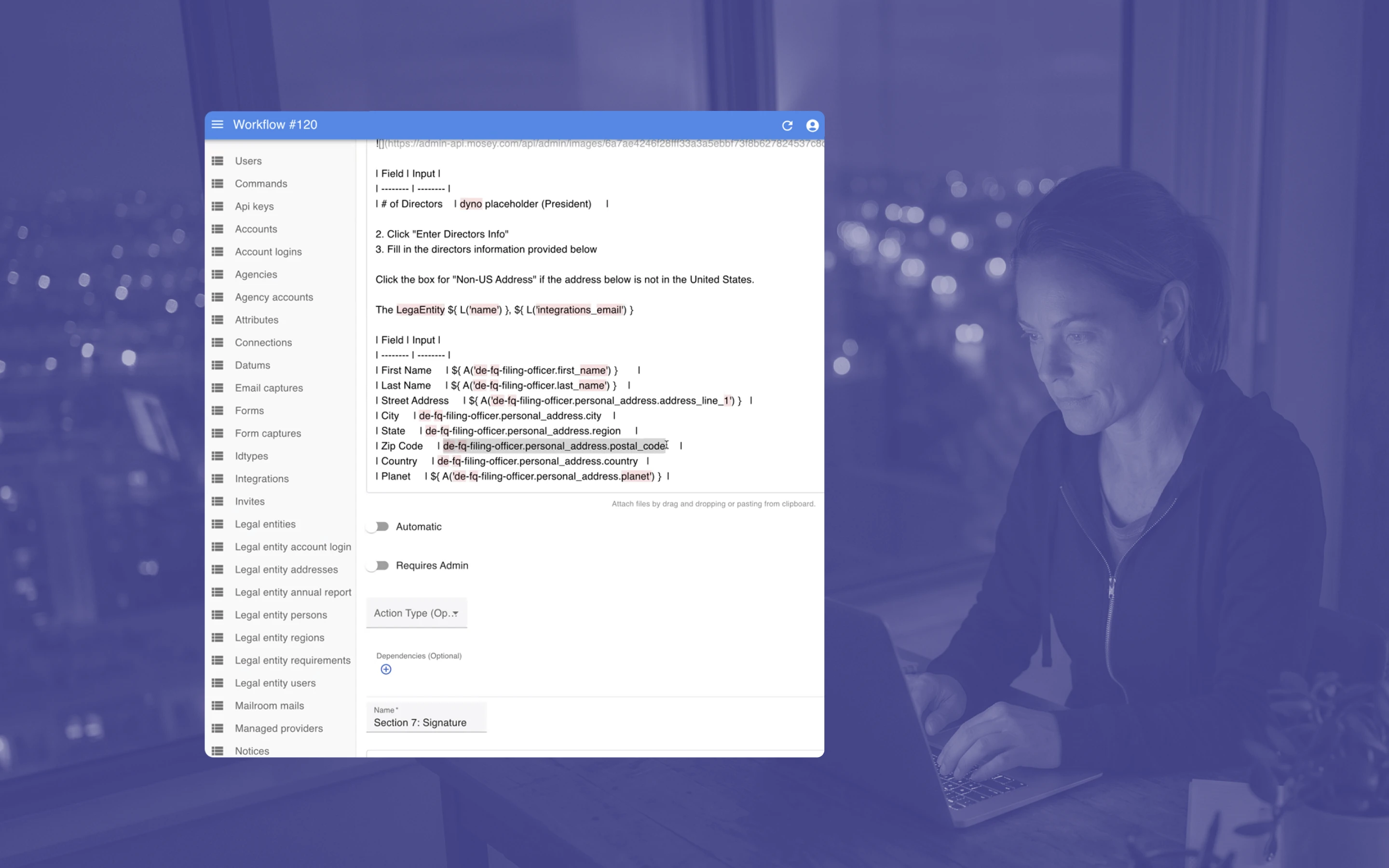 The existing tool was a raw admin panel running on localhost. It exposed database entities as navigation, used markdown with template variables for instructions, and required tribal knowledge held by three engineers.