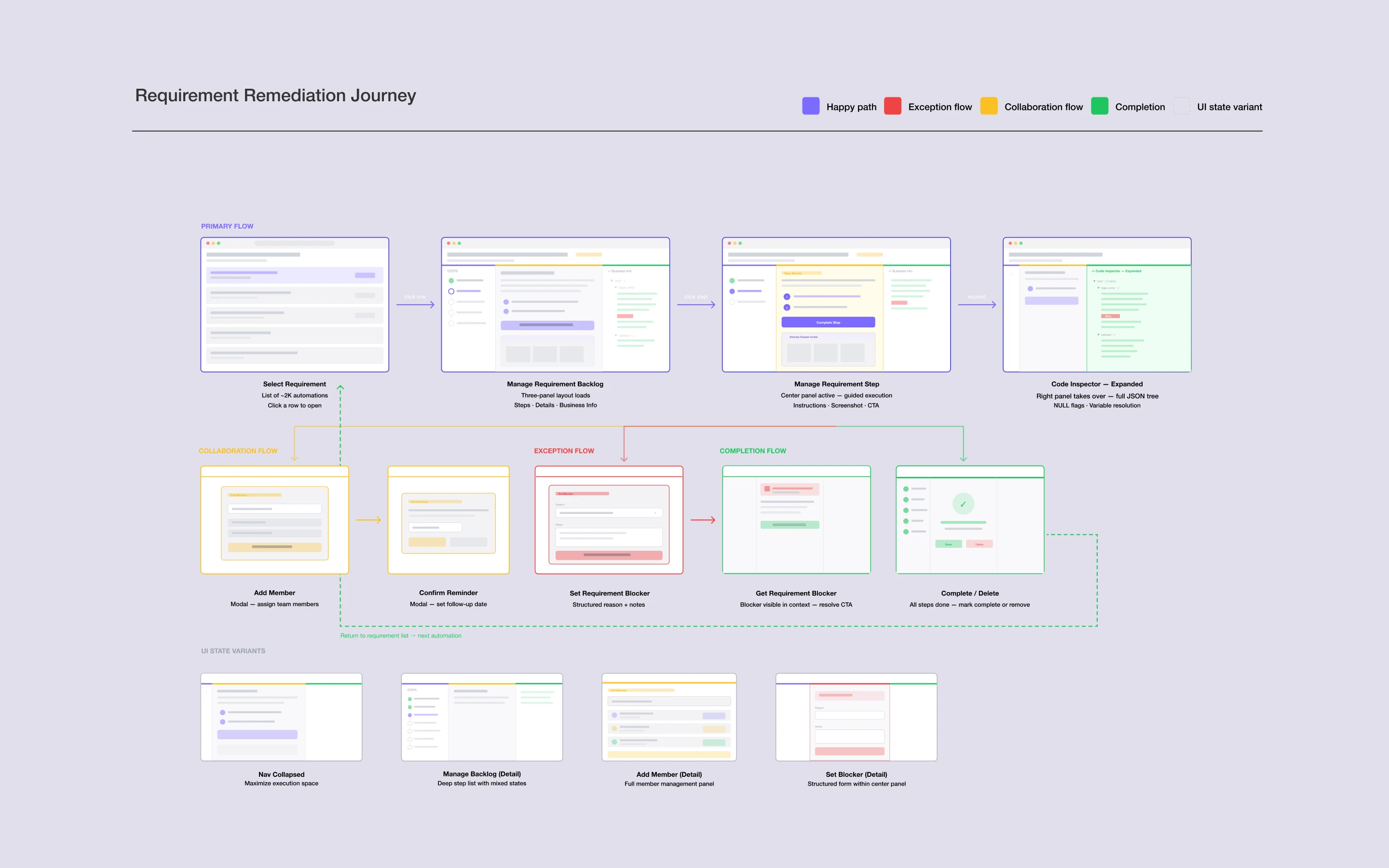 This is the core execution surface — the screen engineers live in for every compliance requirement across every state. The three-zone layout maps directly to the JTBD framework: Orient yourself in the compliance journey, make a clear decision on each step, and verify the data is correct before anything ships. Everything an engineer needs to execute, escalate, or validate is visible without navigating away.